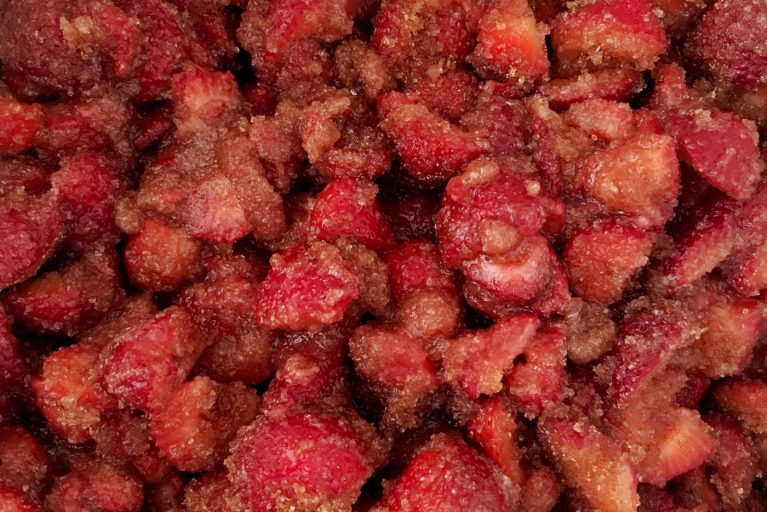 • Put the strawberries and sugar in a big stock pot, slowly stir so all the strawberries are covered